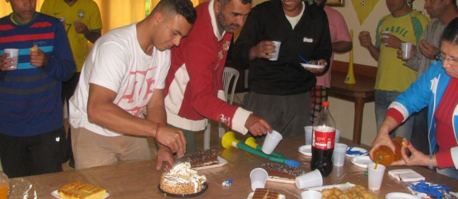 Solange Brasilien noch bei der WM dabei war, wurde jedes Brasilienspiel angeschaut. Der Speisesaal war dekoriert und die entsprechende Fankleidung durfte nicht fehlen. Auf dem Foto ist zu sehen, wie wir in der Halbzeitpause Juans Geburtstag gefeierten. Sein Vater, ein ehemaliger Therapiegast, kam zu uns, um das Spiel anzuschauen und brachte Kuchen und Salzgebäck für die Feier mit.